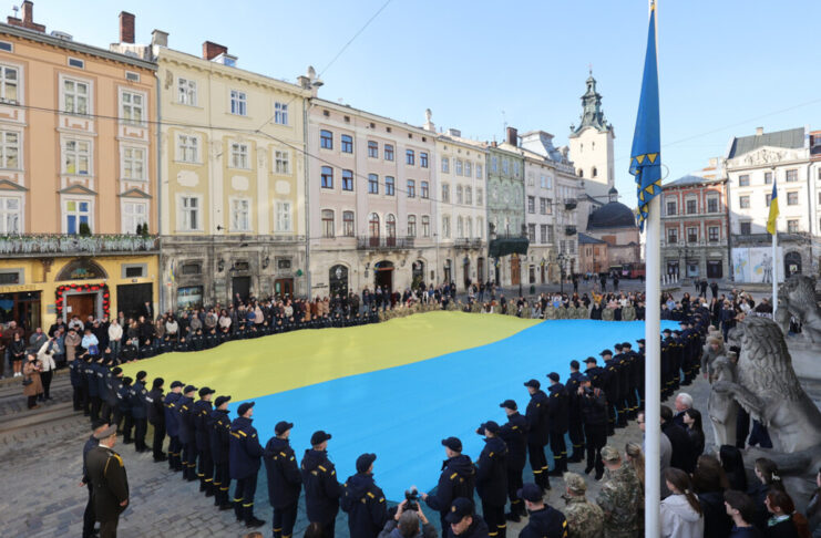 До слова, у Львові така традиція розгортання великого Прапора України на центральній площі та спільне урочисте виконання Гімну триває уже 13 років, тобто з 2013 року. Ініціатива належала львівській міській раді та студентській молоді.