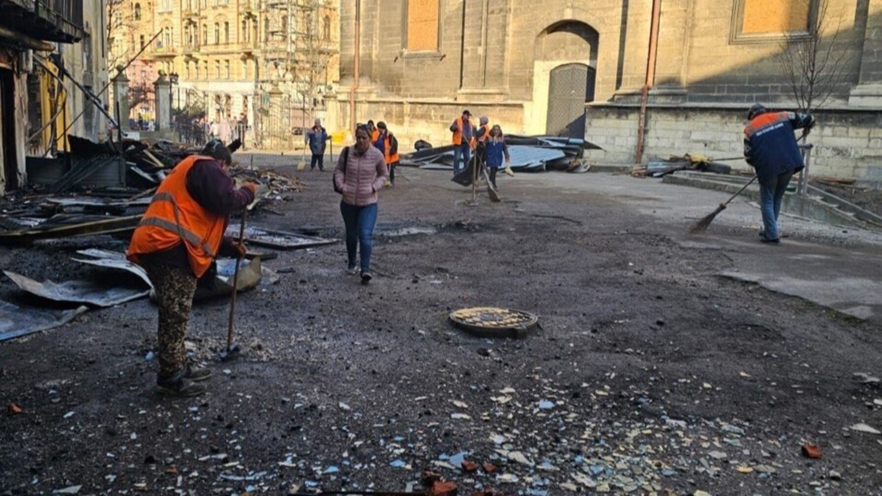 Комунальні працівники і велика техніка з самого ранку продовжує працювати над прибиранням територій, які вчора стали епіцентрами вибухів. За інформацією Галицької і Сихівської районних адміністрацій, двірники прибирають території від уламків будівель, а велика техніка допомагає демонтувати нависання з пошкоджених дахів.